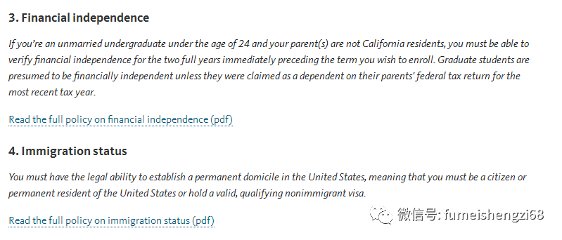 如果是24岁以下的未婚本科生,且父母不是加利福尼亚州居民,则必须能够证实自己的财务独立性。我们的美宝读高中才18岁,财务独立这个条件肯定符合不了。